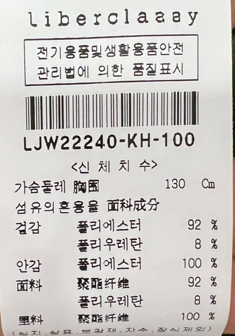1. 제품 소재 (섬유의 조성 또는 혼용률을 백분율로 표시, 기능성인 경우 성적서 또는 허가서) 겉감:폴리에스테르 92%, 폴리우레탄 8% / 안감:폴리에스테르 100%,
