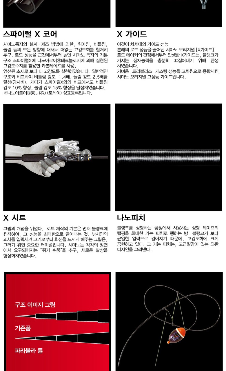 스파이럴X 코어 X시트(펌 피트 시트CI⁴?Ⅱ) X가이드(경사 톱:티탄+SiC 링, #1프리~#2: CI⁴?) 나노피치 나노아로이®테크놀로지※ 터프텍α ?파라볼라 튠R+ 펌 피트 시트CI⁴? 배리어 피니시(#1~#4) 하이퍼 논 콘택트Ⅱ(#3,#4) 매트 러버 코팅(릴 시트부) 탄성 중합체 그립(배트 엔드부) 백색 초릿대 티탄 프레임 SiC IM 가이드(#3,#4) 전 피스 가이드 맞춤 라인 토털 가이드 밸런스 시스템 직물 낚싯대 주머니