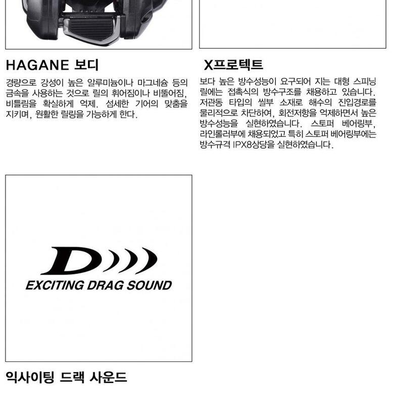 | 품명 | 기어비 | 최대드랙력 (kg) | 자중 (g) | 권사량 PE(호-m) | 최대권상장 (cm/핸들1회전당) | 스풀치수 (경mm/폭mm) |