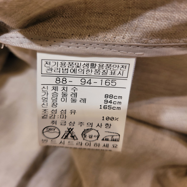 | 1. 제품 소재 (섬유의 조성 또는 혼용률을 백분율로 표시, 기능성인 경우 성적서 또는 허가서) | 마100% |