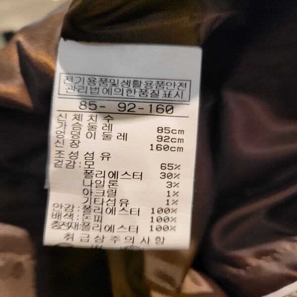 1. 제품 소재 (섬유의 조성 또는 혼용률을 백분율로 표시, 기능성인 경우 성적서 또는 허가서) 모65%,폴리에스터30%,나일론3%,아크릴1%,기타섬유1%,배색 돈피100%