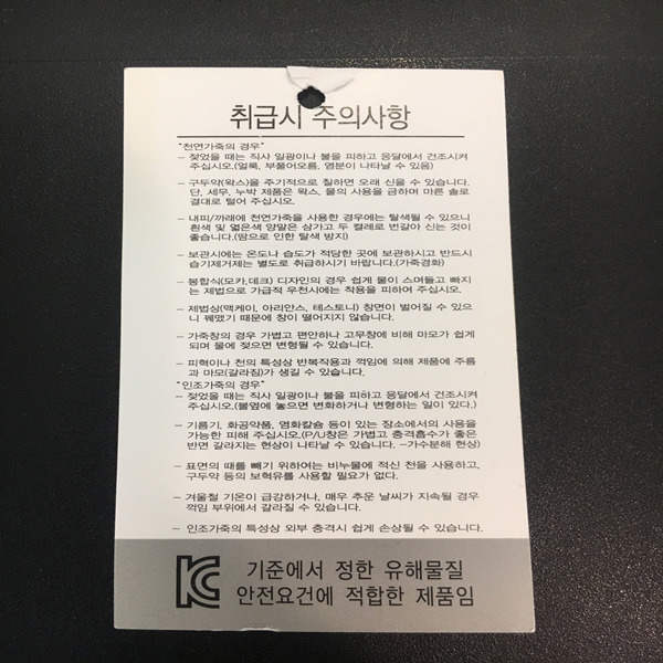 *내피/까래에 천연가죽을 사용한 경우에는 탈색 될 수 있으니 흰색 및 엷은색 양말은 삼가고