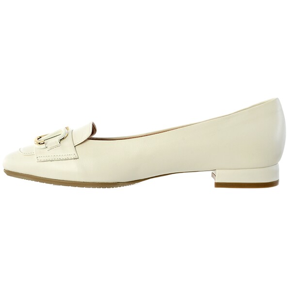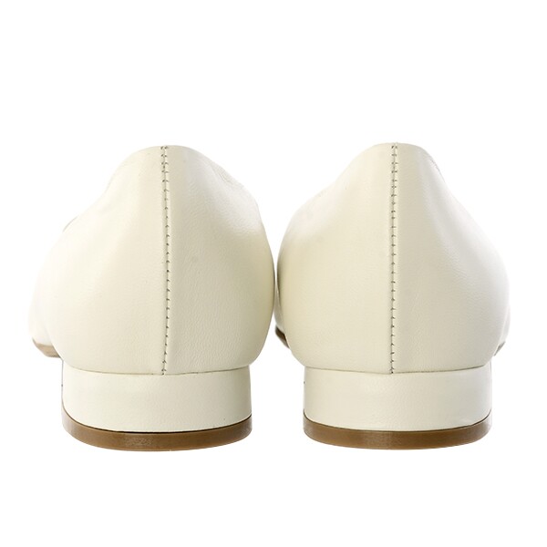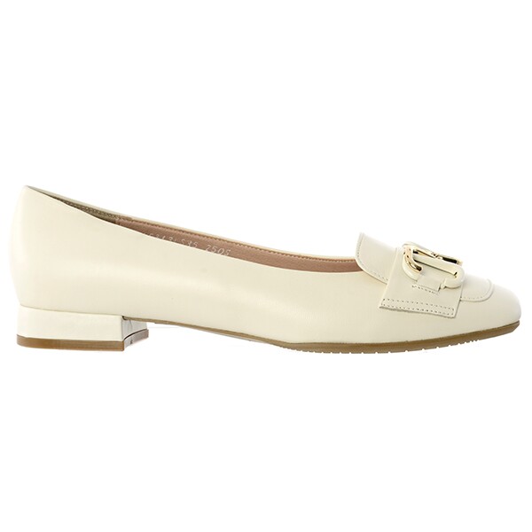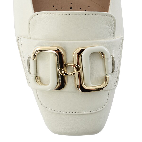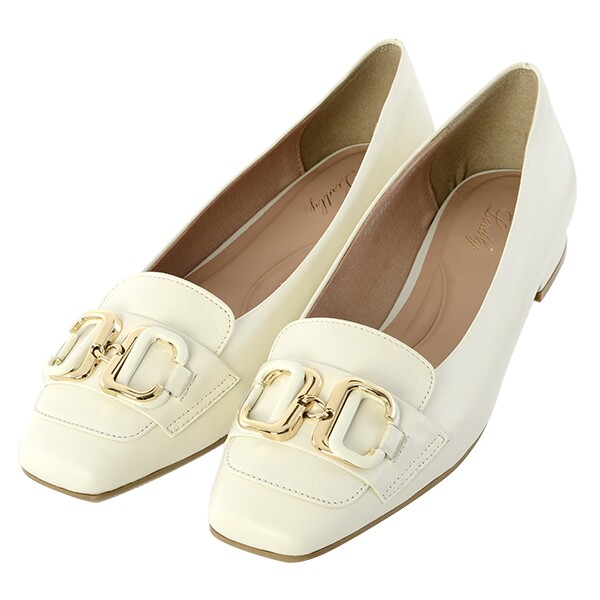 1.트렌드가 적용된 홀스빗 형태의 투블럭 장식을 사용한 플랫로퍼.