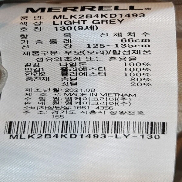 대구백화점SG 머렐 MLK2B4KD1493 키즈 경량 다운 자켓