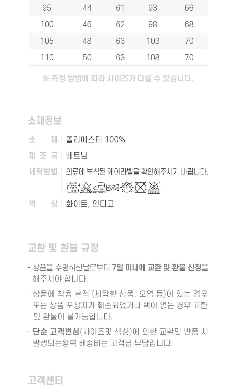 • 처음 배송된 상품상태와 다를 경우(세탁/착용 후 외출하신 경우) 반품이 불가합니다.