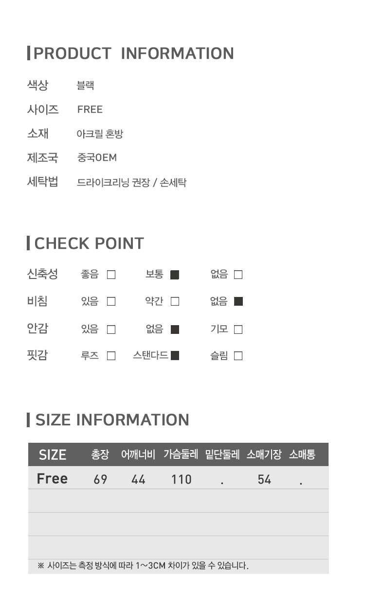 | 1. 제품 소재 (섬유의 조성 또는 혼용률을 백분율로 표시, 기능성인 경우 성적서 또는 허가서) | 상세페이지참고 |