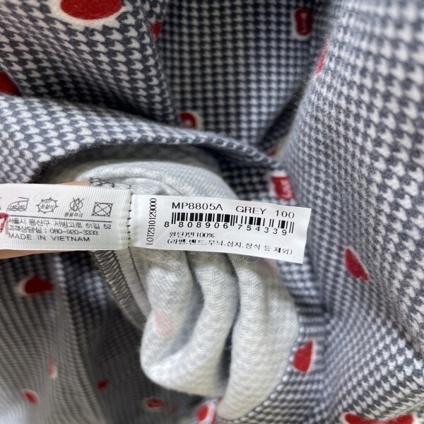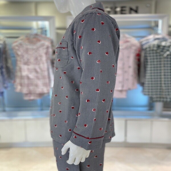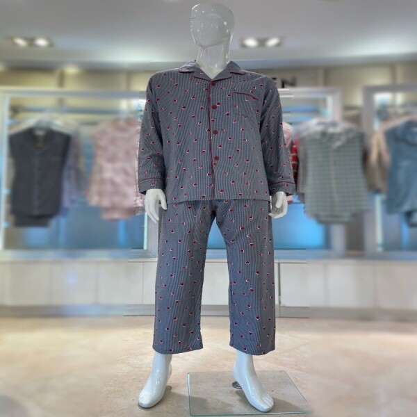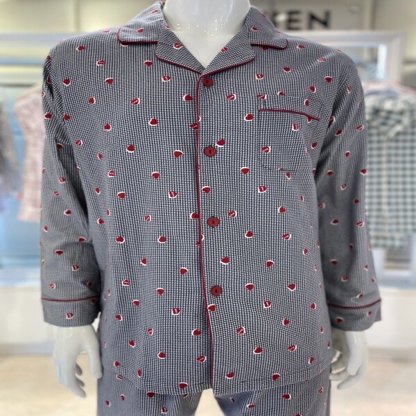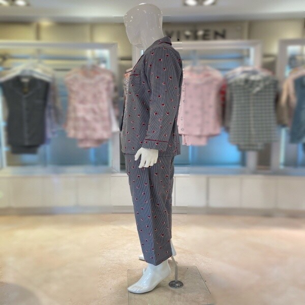 면100%이며 평소 면잠옷을 선호하는 고객님께도 인기가 좋으며 그레이톤을 바탕으로레드 하트무늬가 사랑스럽게 프린팅되어 얼굴까지 화사하게 보여줍니다.몸에 닿는 감촉도 부드럽고 남여 커플 상품으로 선물하기에도 너무나 좋습니다.