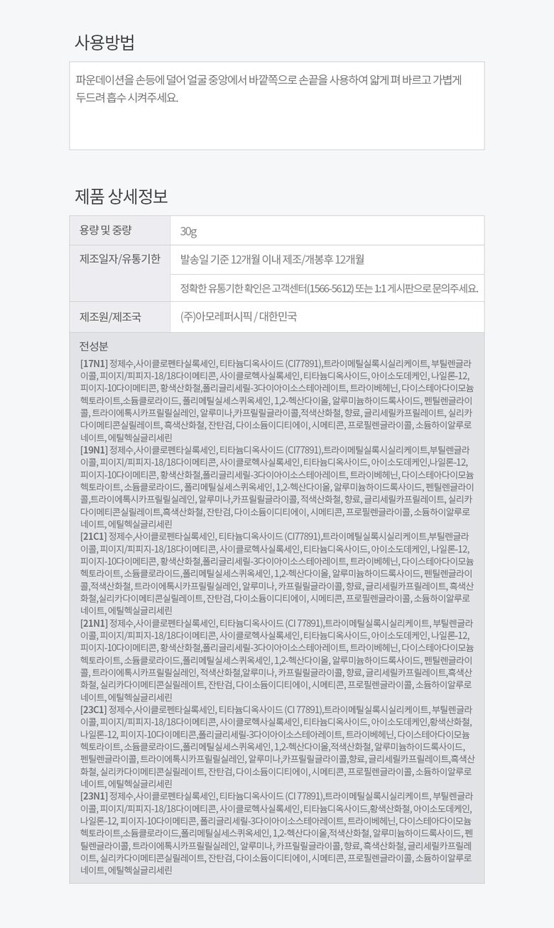 7. 주요성분 | [17N1] 정제수,사이클로펜타실록세인, 티타늄디옥사이드 (CI77891),트라이메틸실록시실리케이트, 부틸렌글라