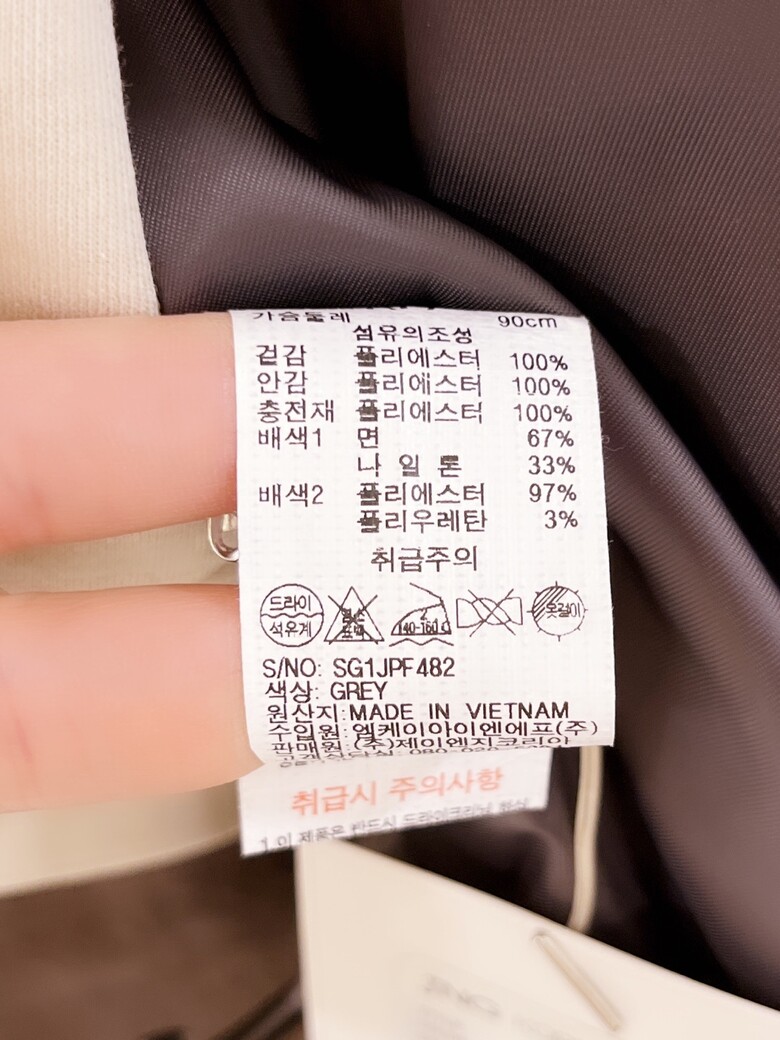 제품소재 : 겉감-폴리에스터100% 안감-폴리에스터100% 충전재- 폴리에스터100% 배색1-면67% 나일론33% 배색2- 폴리에스터97% 폴리우레탄3%