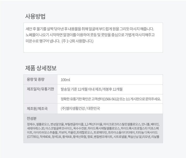 | 4. 사용방법 | 1.세안 후 물기를 닦아내고 눈가를 제외한 얼굴전체에 부드럽게 펴발라 원을 그리듯 마시지해줍니다. 2.잠시 후 각질과 노폐물이 얼굴에서 밀려나오기 시작하면 콧망울과 미간 등 각질이 측히 고민되는 부분을 중심으로 세심하게 마사지해 주고 미온수로 헹구어 냅니다. |