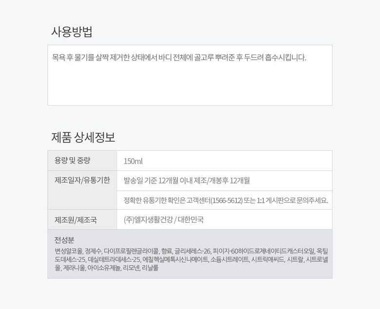 | 4. 사용방법 | 목욕 후 물기를 살짝 제거한 상태에서 바디 전체에 골고루 뿌려준 후 두드려 흡수시킵니다. |