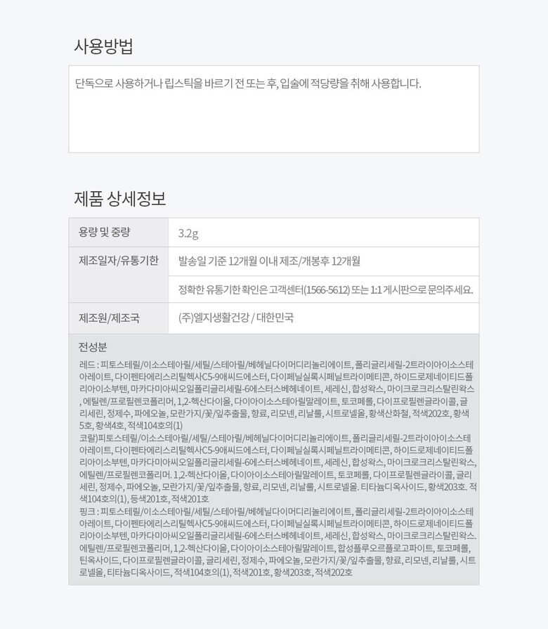 4. 사용방법 | 단독으로 사용하거나 립스틱을 바르기 전 또는 후, 입술에 적당량을 취해 사용합니다. |