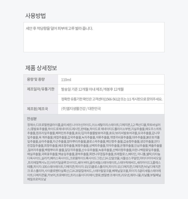 | 9. 사용 시 주의사항 | 1. 화장품을 사용 중 붉은 반점, 부어오름, 가려움증, 자극 등의 이상이 있는 경우, 적용 부위가 직사광선에 의하여 이상이 생긴 경우 사용을 중지하시고 피부과 전문의와 상담하세요. 2. 상처가 있는 부위, 습진 및 피부트러블 등의 이상이 있는 부위에는 사용하지 마세요. 3. 보관 및 취급시 주의사항 가)사용 후에는 반드시 마개를 닫아두세요. 나)유아ㆍ소아의 손이 닿지 않는 곳에 보관하세요. 다)고온 다습한 곳 및 직사광선 닿는 장소는 피해주세요. |