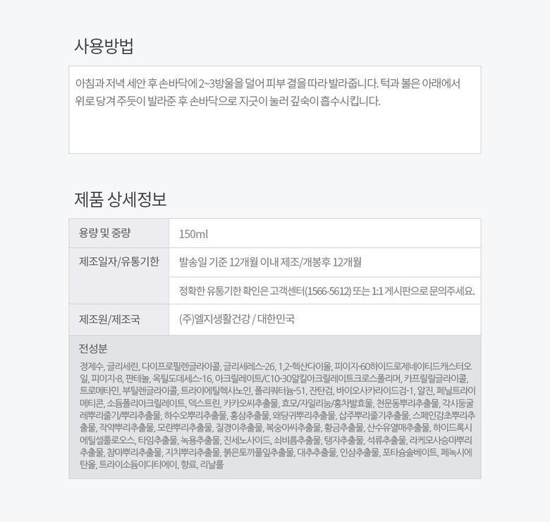 | 9. 사용 시 주의사항 | 1. 화장품을 사용 중 붉은 반점, 부어오름, 가려움증, 자극 등의 이상이 있는 경우, 적용 부위가 직사광선에 의하여 이상이 생긴 경우 사용을 중지하시고 피부과 전문의와 상담하세요. 2. 상처가 있는 부위, 습진 및 피부트러블 등의 이상이 있는 부위에는 사용하지 마세요. 3. 보관 및 취급시 주의사항 가)사용 후에는 반드시 마개를 닫아두세요. 나)유아ㆍ소아의 손이 닿지 않는 곳에 보관하세요. 다)고온 다습한 곳 및 직사광선 닿는 장소는 피해주세요. |