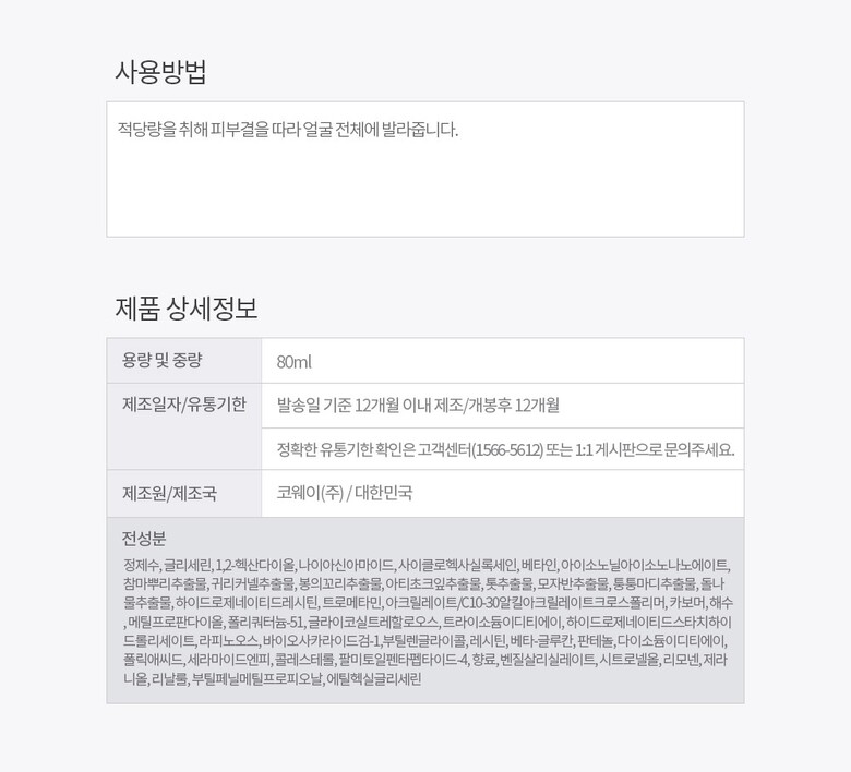 | 4. 사용방법 | 적당량을 취해 피부결을 따라 얼굴 전체에 발라줍니다. |