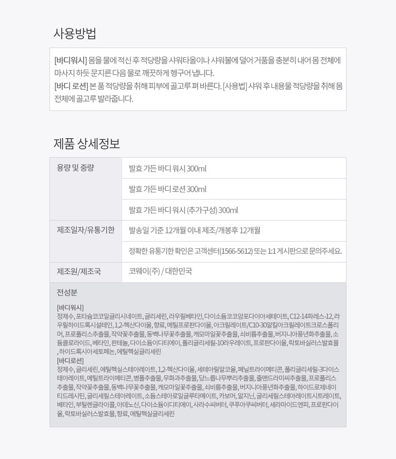 | 1. 용량 및 중량 | 바디 워시 600ml, 바디로션 300ml |