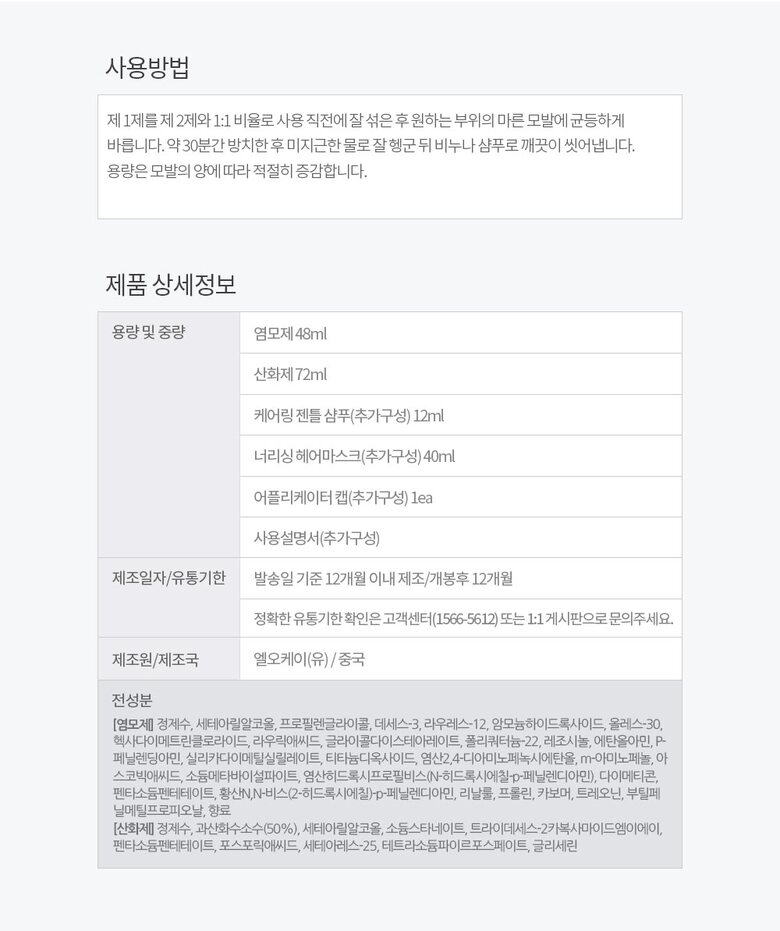 | 1. 용량 및 중량 | 크림 염모제 48ml,산화제 72ml |