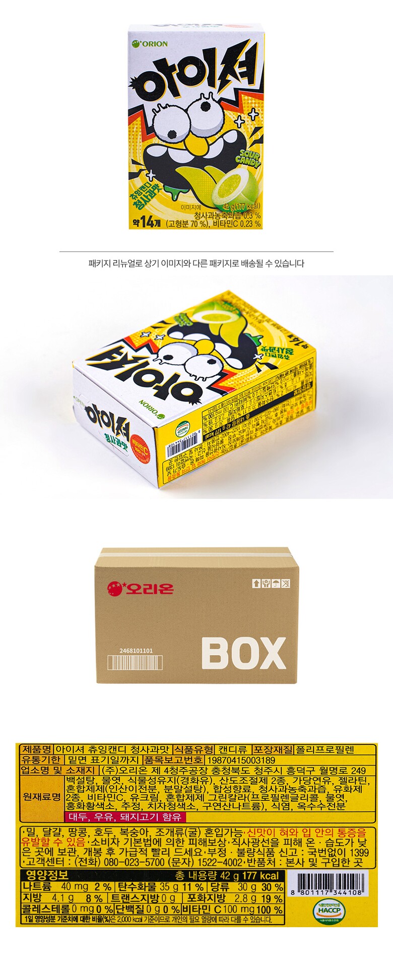해당 상품은 [ 오리온 아이셔 츄잉캔디 청사과맛 42g 6입 ] 구성의 상품입니다.