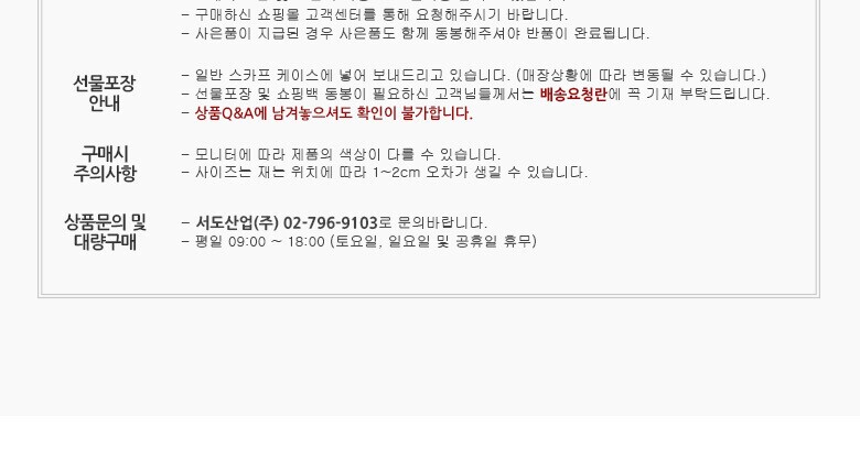 상품불량에 의한 반품, A/S, 품질보증 및 피해보상 등에 관한 사항은 소비자 분쟁해결기준(공정거래위원회 고시) 구매자가 미성년자인 경우에는 상품 구입시 법정대리인이 동의하지 아니하면 미성년자 본인 또는 법정대리인이 구매취소 할 수 있습니다. |