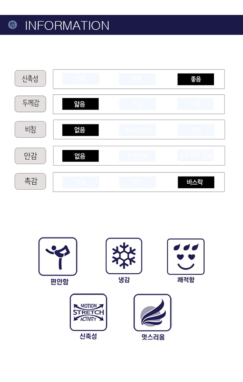 | 1. 제품 소재 (섬유의 조성 또는 혼용률을 백분율로 표시, 기능성인 경우 성적서 또는 허가서) | 상세설명참고 |