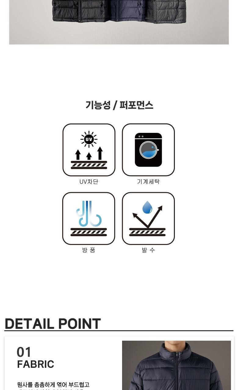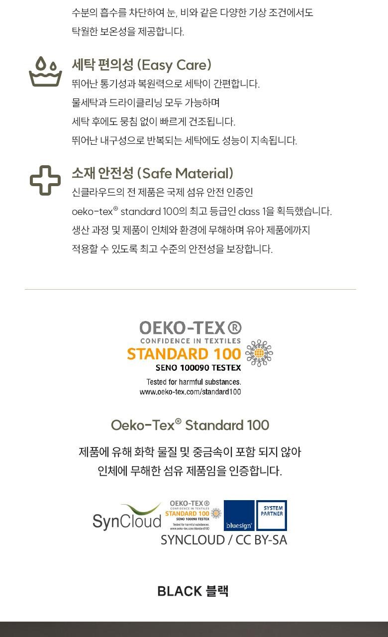 1. 제품 소재 (섬유의 조성 또는 혼용률을 백분율로 표시, 기능성인 경우 성적서 또는 허가서) | 겉감 : 폴리에스터 100% 안감 : 폴리에스터 100% 충전재 : 폴리에스터 100% |