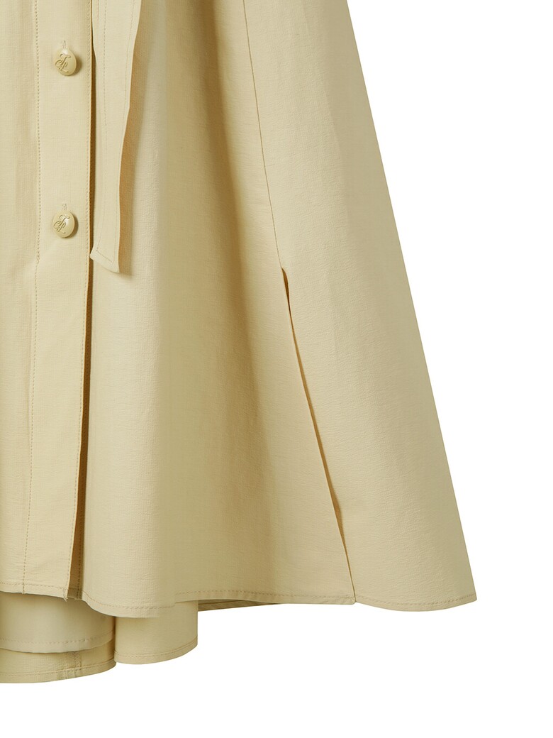 - 부분적으로 셔링을 잡아주고 밑단으로 갈수록 퍼지는 실루엣으로