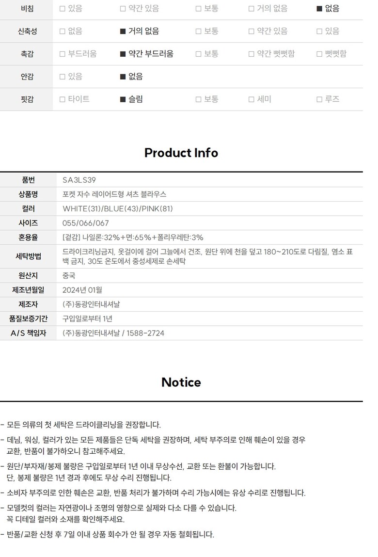 6. 세탁방법 및 취급시 주의사항 | 상품상세참조 |