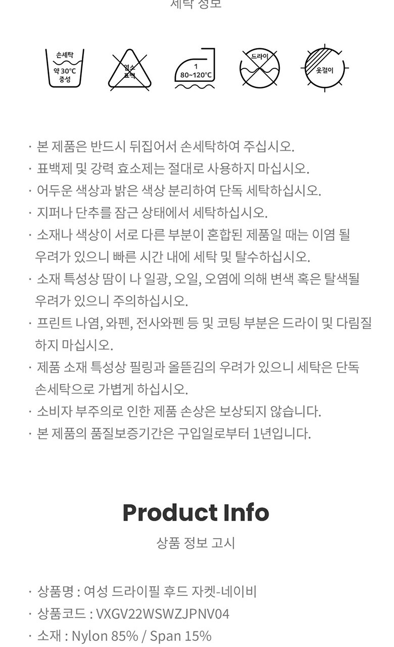 | 6. 세탁방법 및 취급시 주의사항 | 손세탁 |
