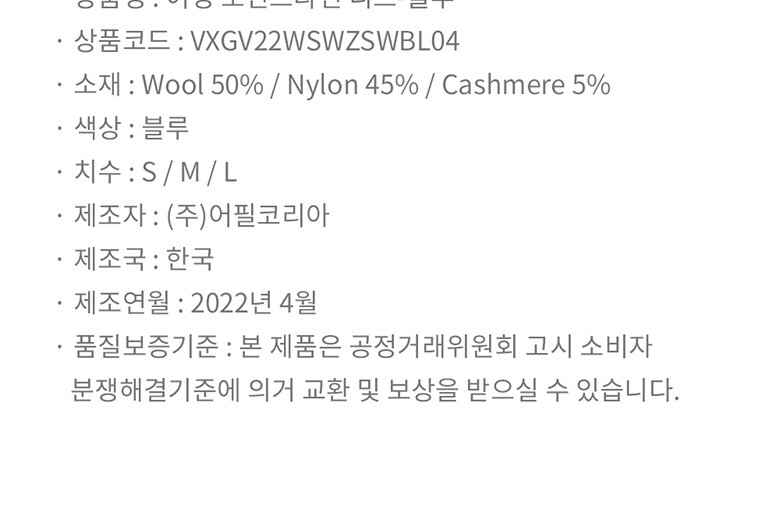1. 제품 소재 (섬유의 조성 또는 혼용률을 백분율로 표시, 기능성인 경우 성적서 또는 허가서) | [겉감] 울 50%, 나일론 45%, 캐시미어 5% |