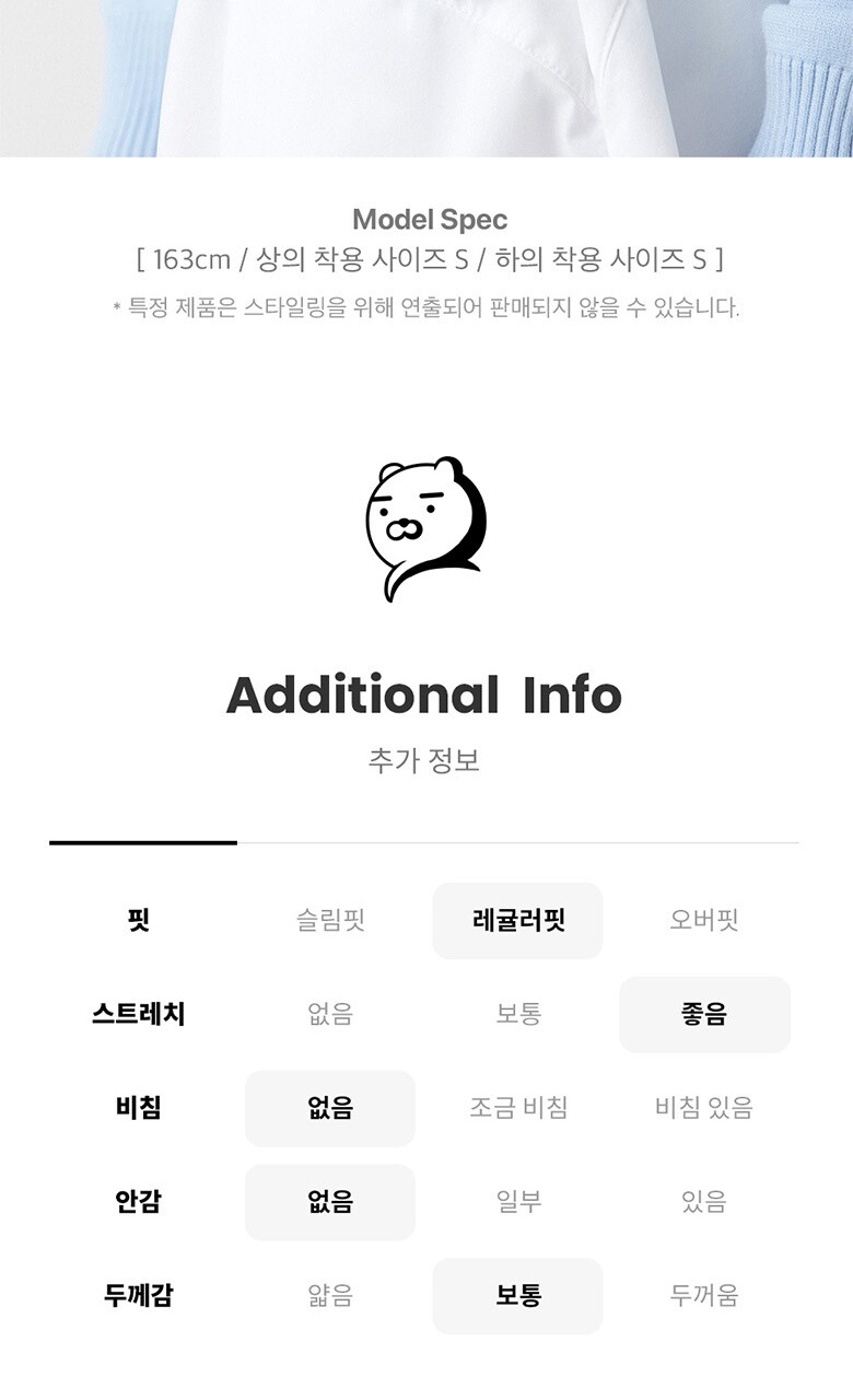 1. 제품 소재 (섬유의 조성 또는 혼용률을 백분율로 표시, 기능성인 경우 성적서 또는 허가서) | [겉감] 비스코스 72%, PTT 28% [콤보] 비스코스 80%, 나일론 20% |