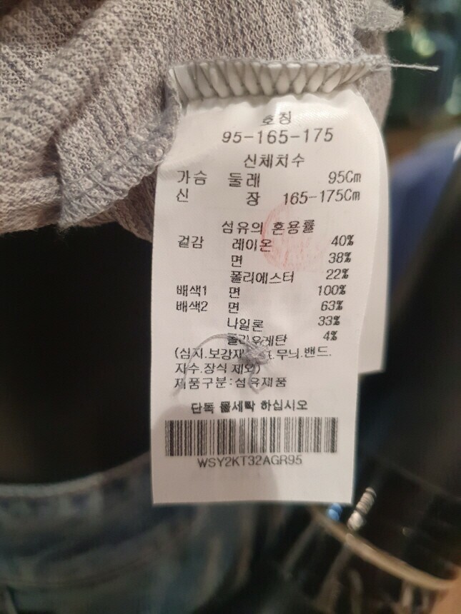 | 1. 제품 소재 (섬유의 조성 또는 혼용률을 백분율로 표시, 기능성인 경우 성적서 또는 허가서) | 겉감 : 레이온 40% , 면 38% , 폴리에스터 22% 배색1 : 면 100% 배색 |