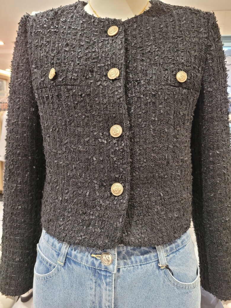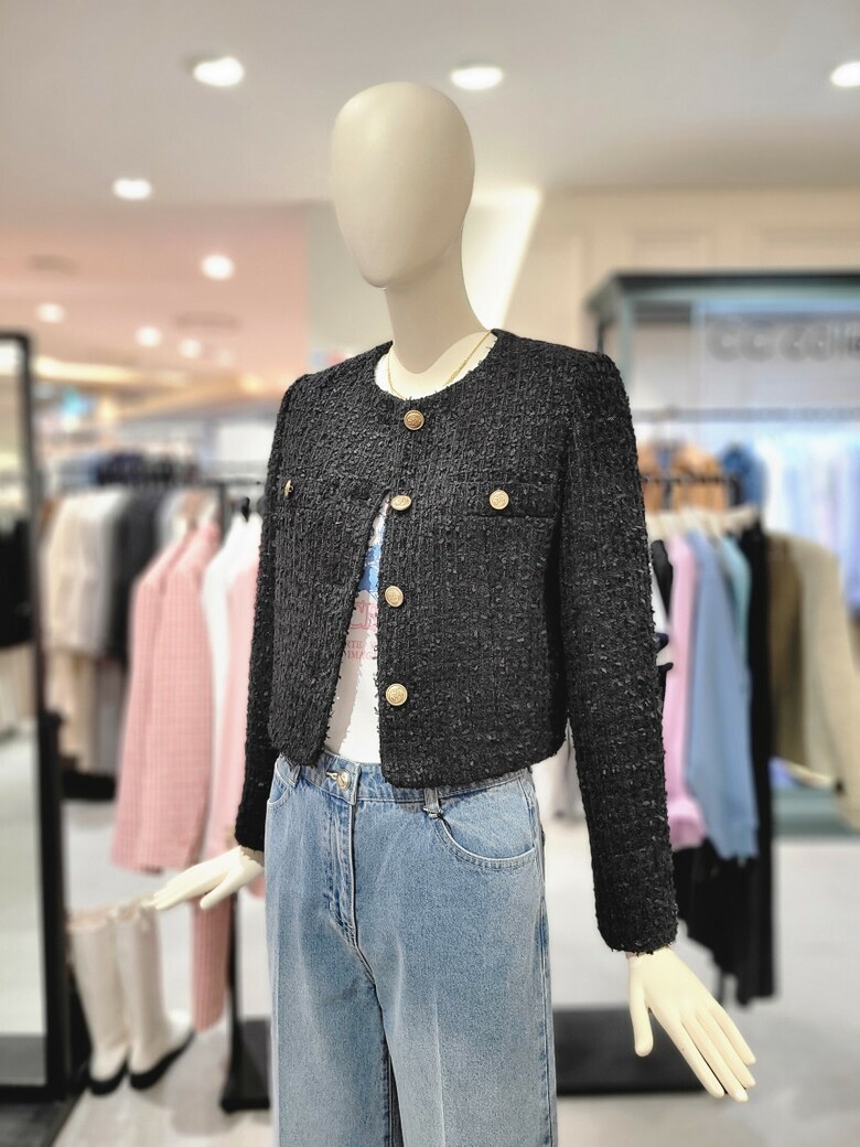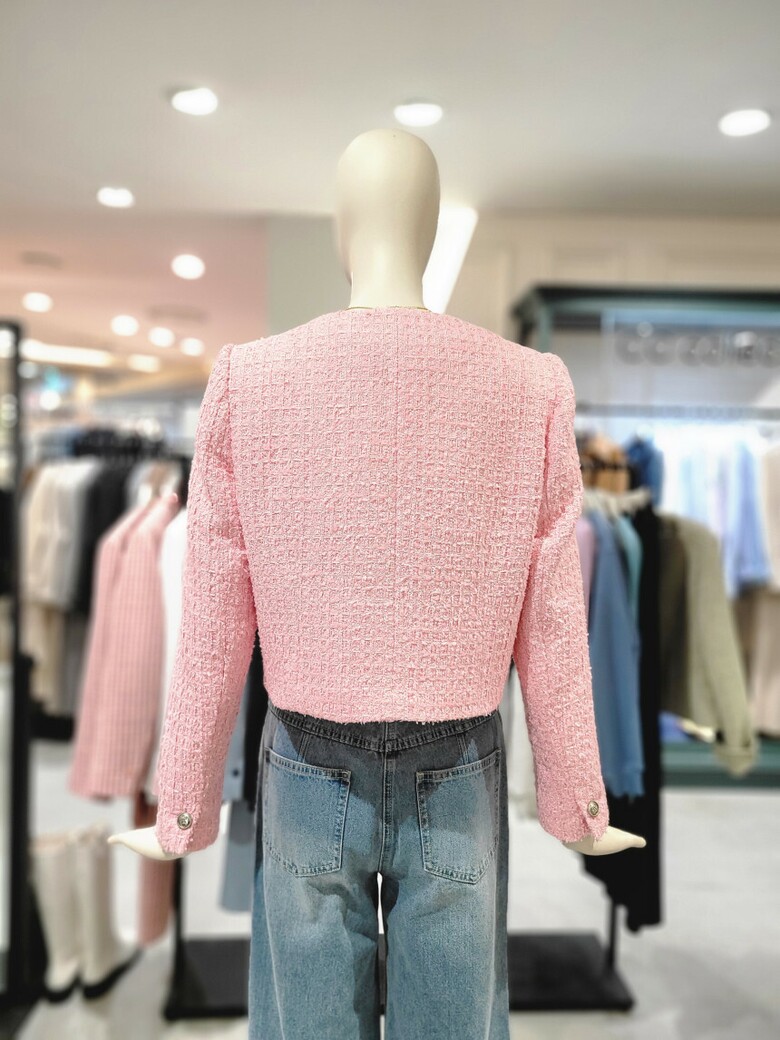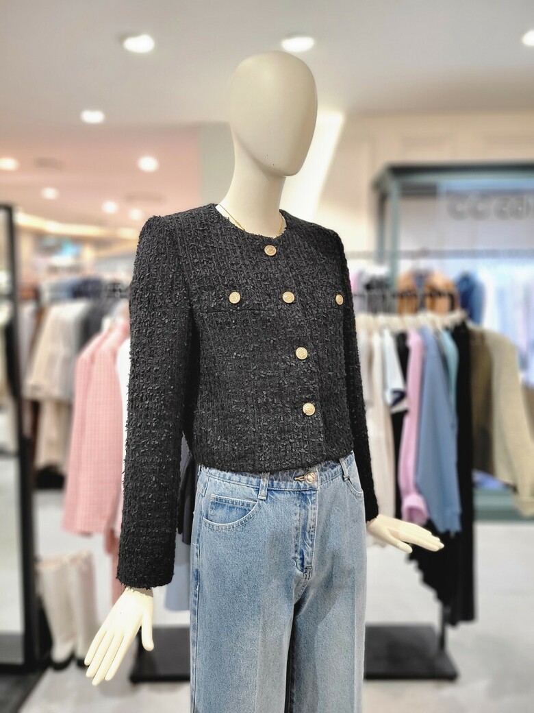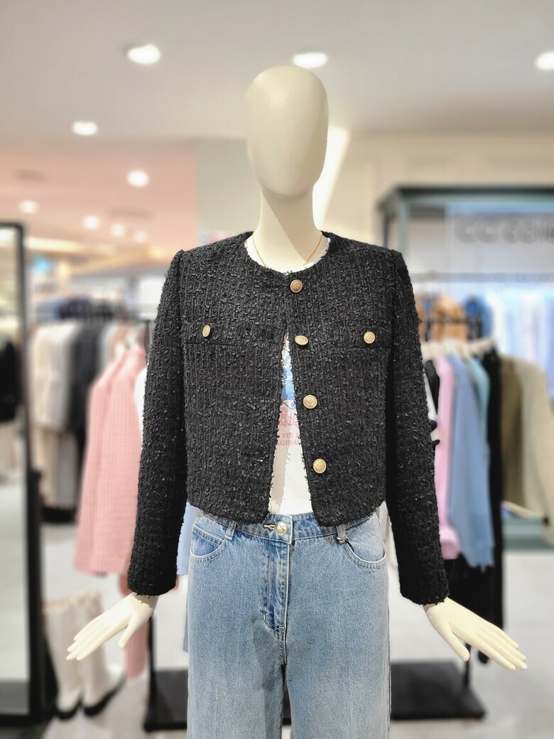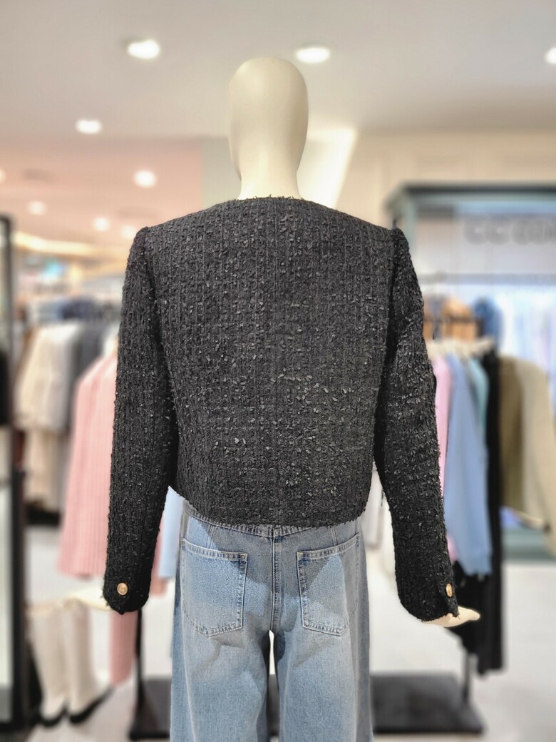 칼라리스 디자인이 깔끔하게 제안된 트위드 자켓입니다.