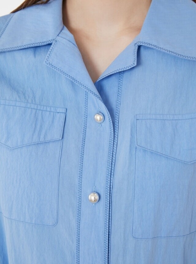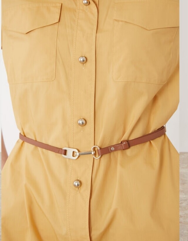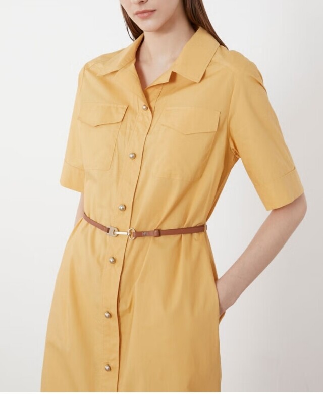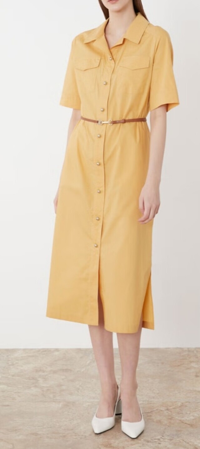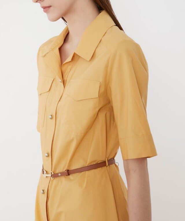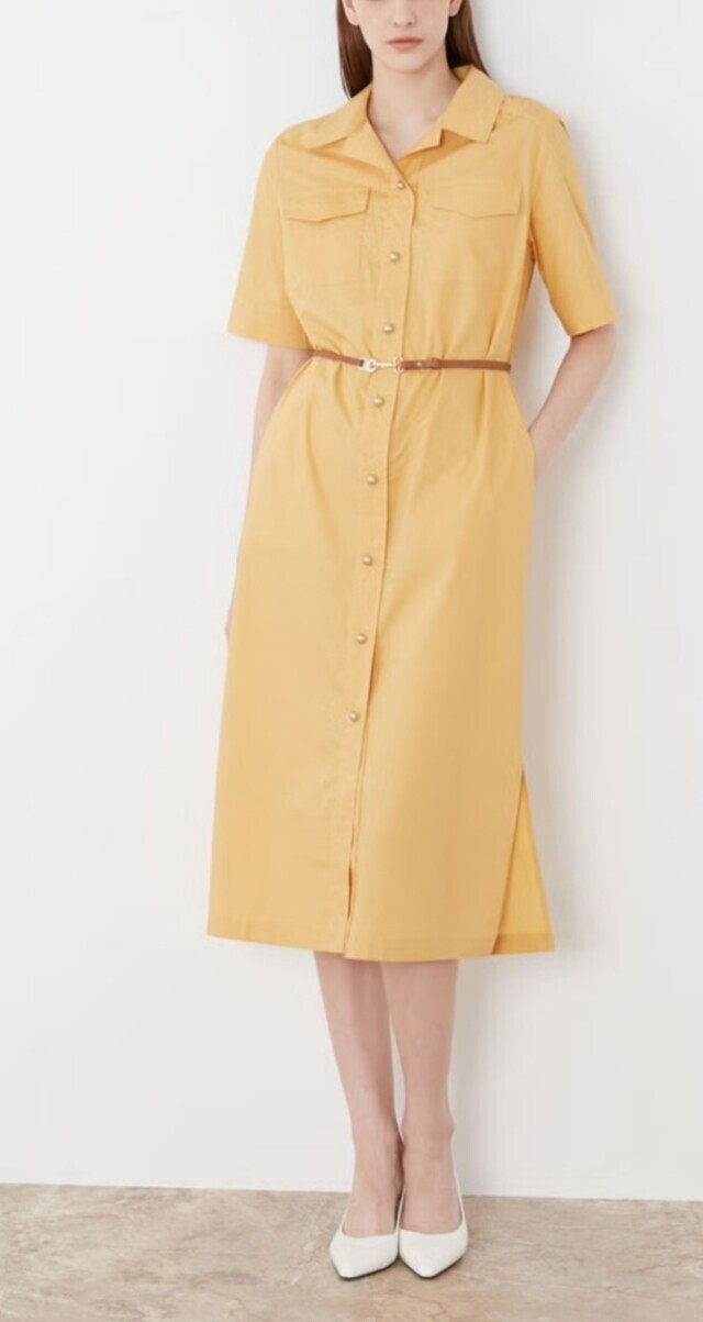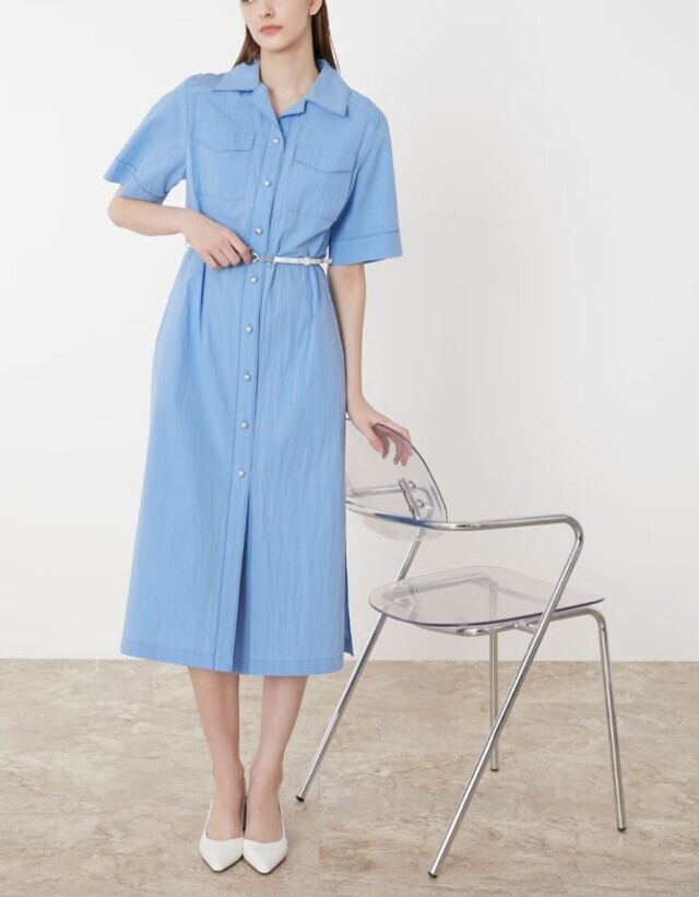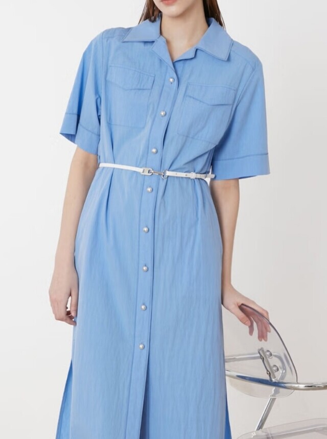 셔츠형 원피스로 앞 단작 자수 디테일이 고급스러우며 가죽 옵션 밸트로 실루엣 조절이 가능하여 슬림하