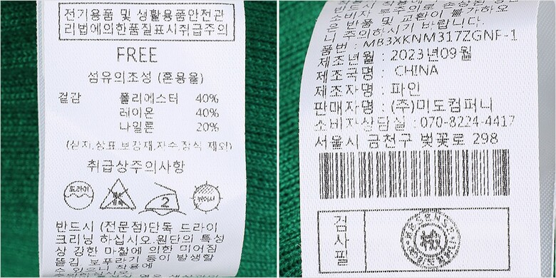 | 1. 제품 소재 (섬유의 조성 또는 혼용률을 백분율로 표시, 기능성인 경우 성적서 또는 허가서) | 겉감:폴리에스터40% 나일론20% 레이온40% |