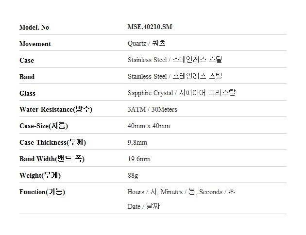 | 7. 주요 사양 | 스테인리스스틸 시계 쿼츠 |