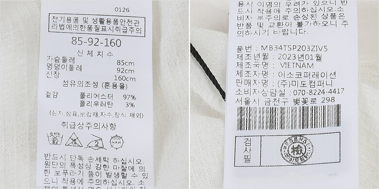 | 1. 제품 소재 (섬유의 조성 또는 혼용률을 백분율로 표시, 기능성인 경우 성적서 또는 허가서) | 겉감:폴리에스터97% 폴리우레탄3% |