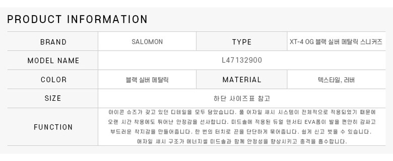 살로몬 SALOMON L47132900 XT-4 OG 블랙 실버 메탈릭 공용 스니커즈