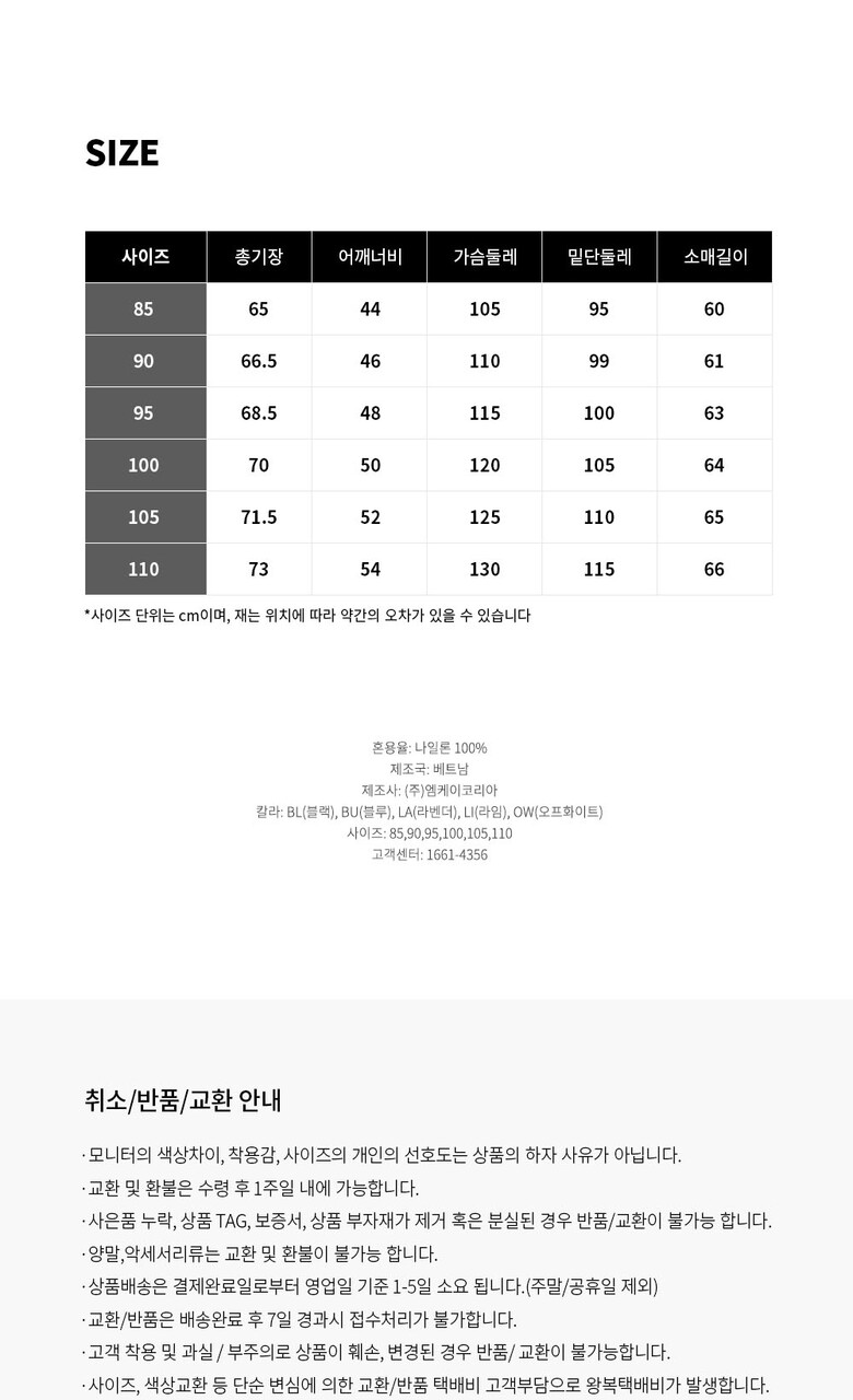 • 처음 배송된 상품상태와 다를 경우(세탁/착용 후 외출하신 경우) 반품이 불가합니다.