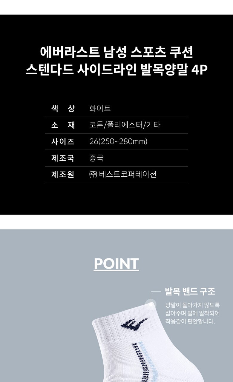 에버라스트 남성 스포츠 쿠션 스텐다드 사이드라인 발목양말 4P_WHBL