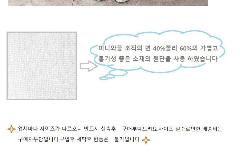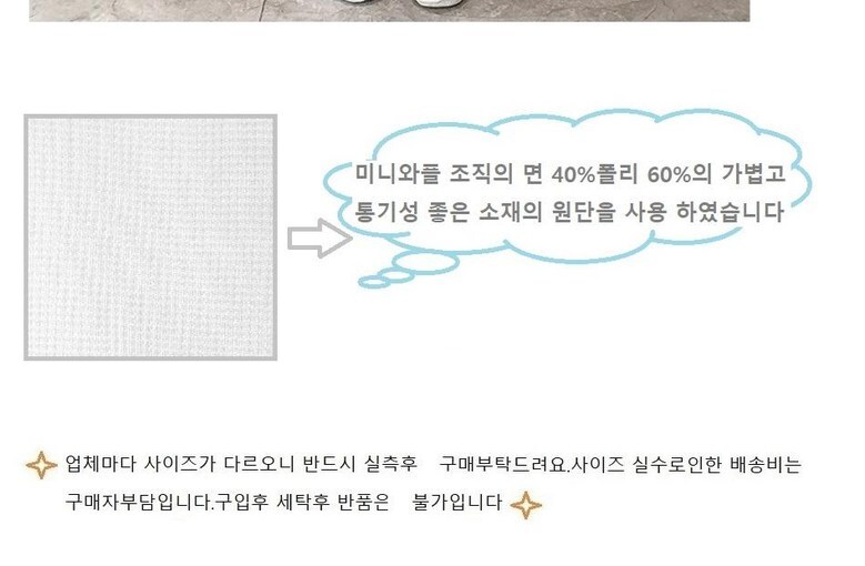 | 1. 제품 소재 (섬유의 조성 또는 혼용률을 백분율로 표시, 기능성인 경우 성적서 또는 허가서) | 상세페이지 참조 |