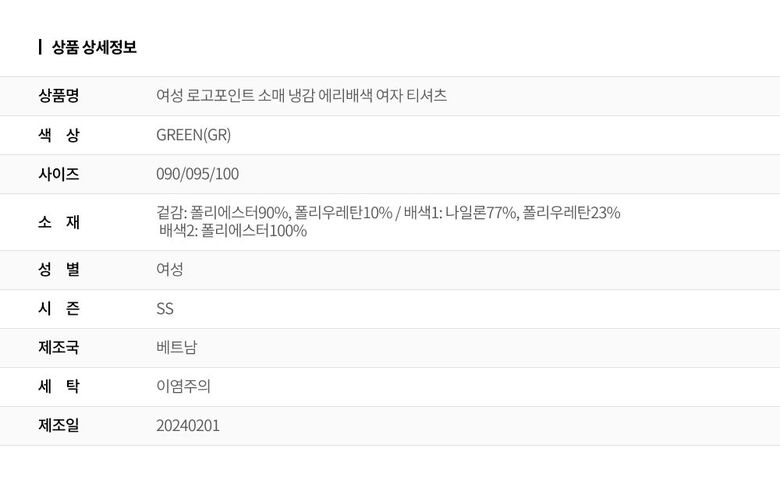 | 1. 제품 소재 (섬유의 조성 또는 혼용률을 백분율로 표시, 기능성인 경우 성적서 또는 허가서) | 겉감: 폴리에스터90%, 폴리우레탄10% / 배색1: 나일론77%, 폴리우레탄23% / 배색2: 폴리에스터100% |