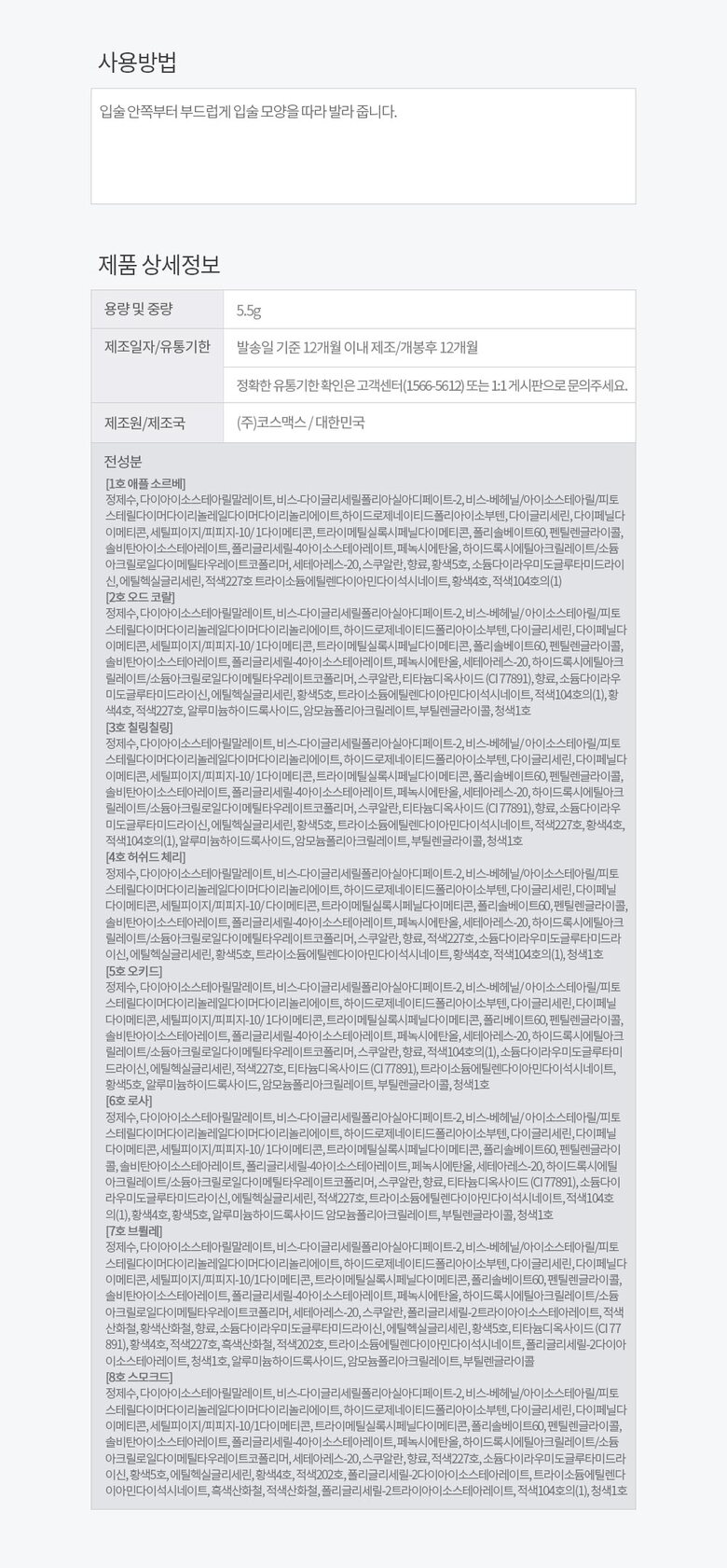 | 4. 사용방법 | 입술 안쪽부터 부드럽게 입술 모양을 따라 발라 줍니다. |