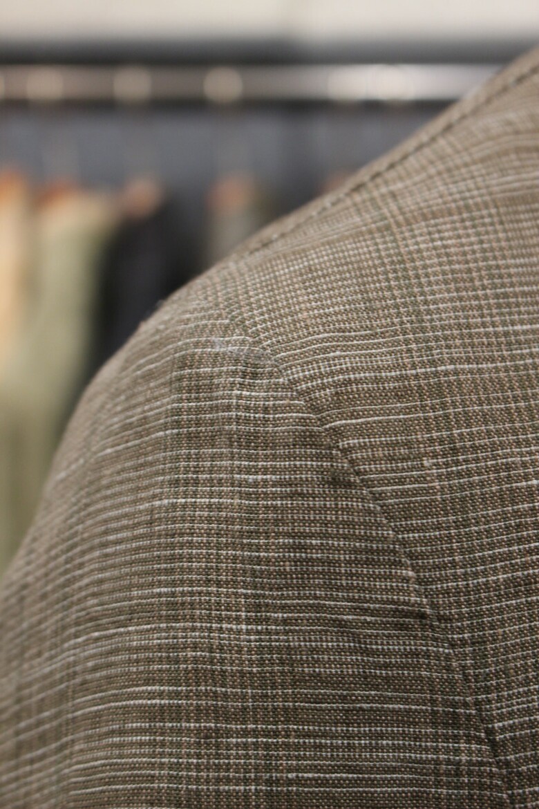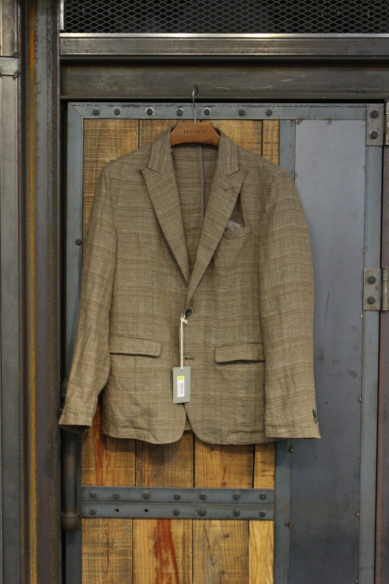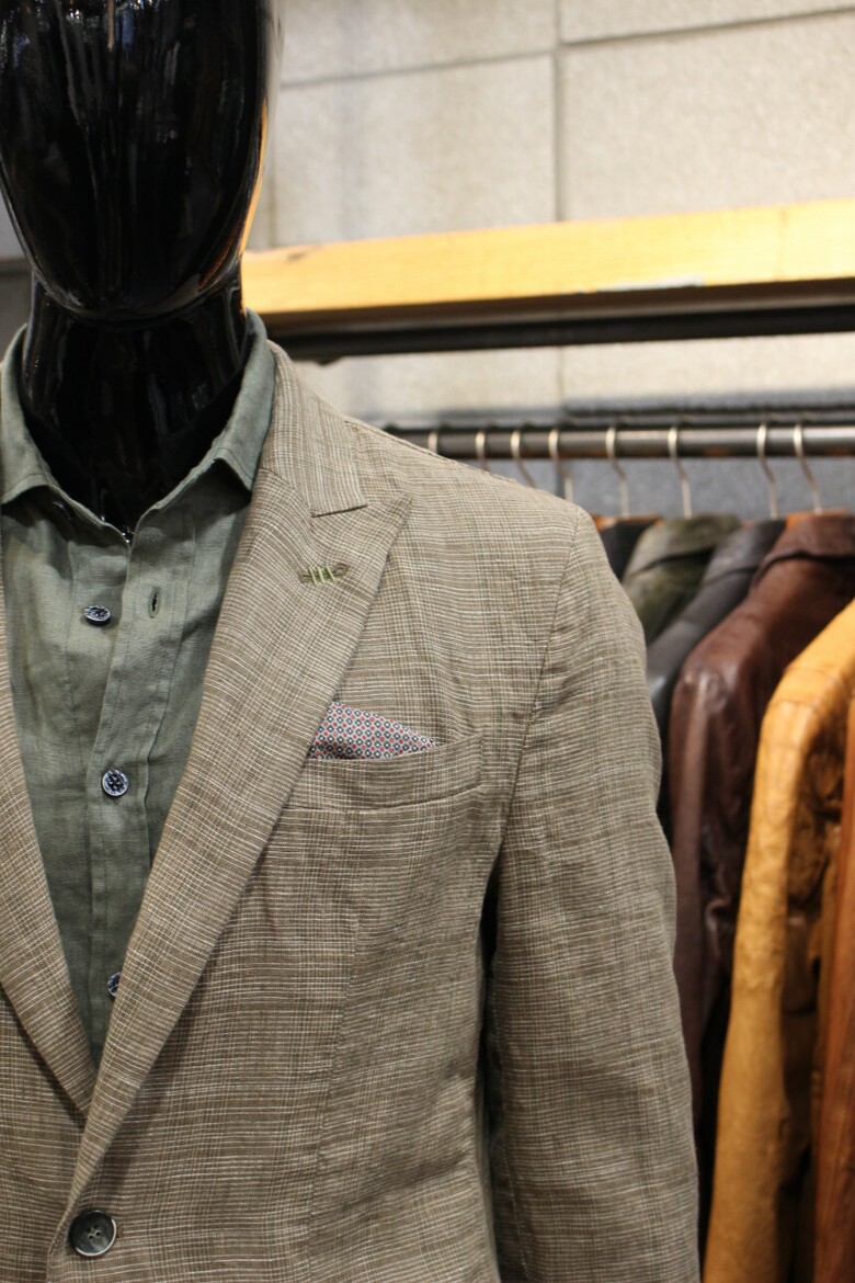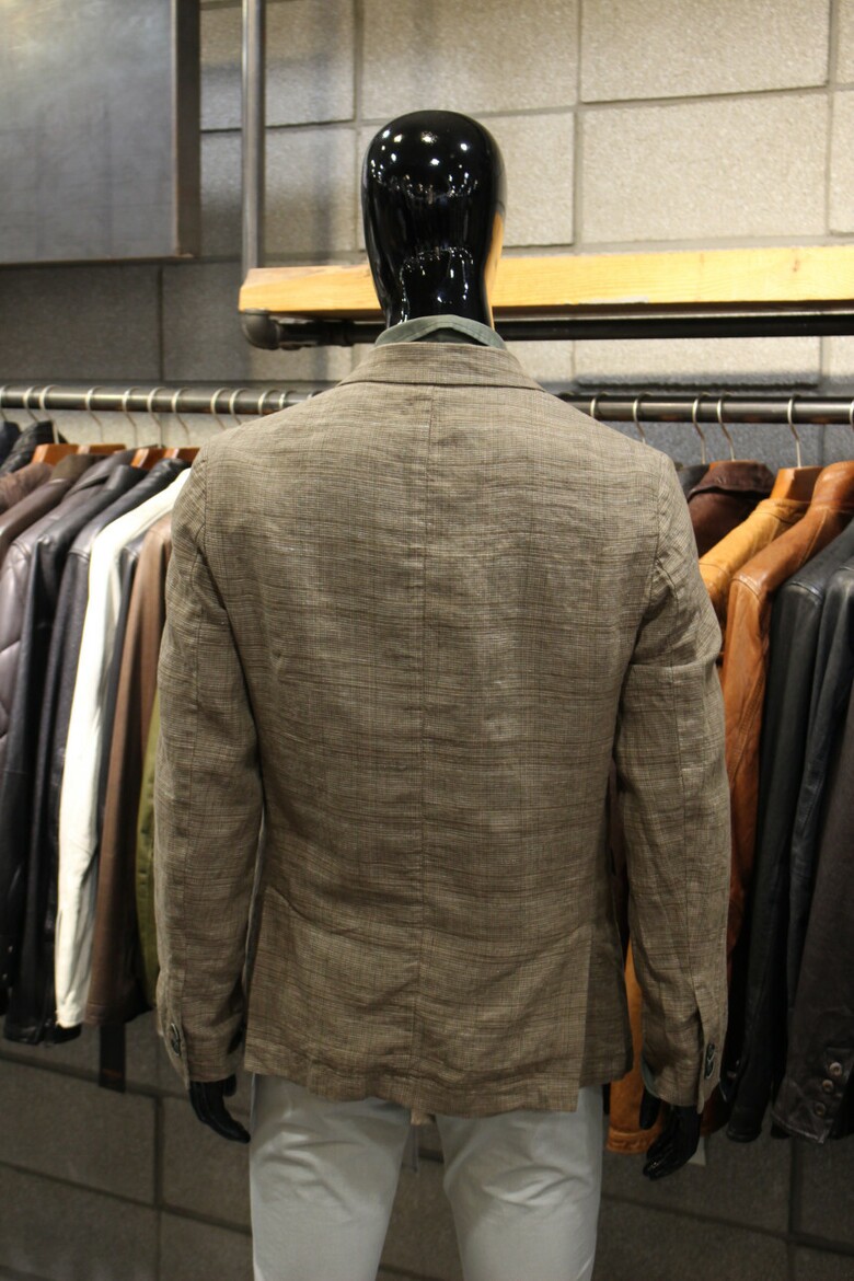 클래식한 느낌이 강조된 브라운체크 린넨자켓입니다
