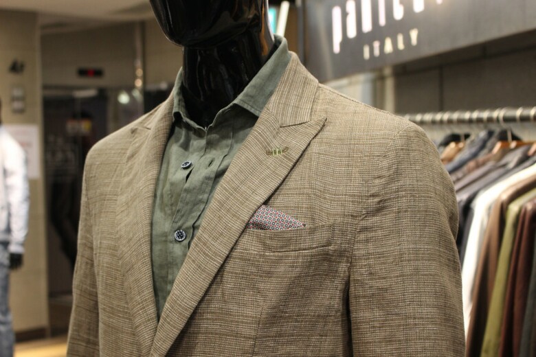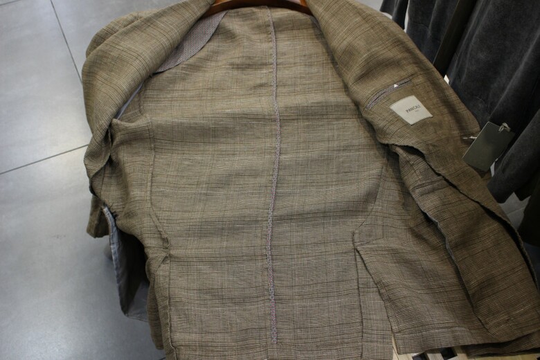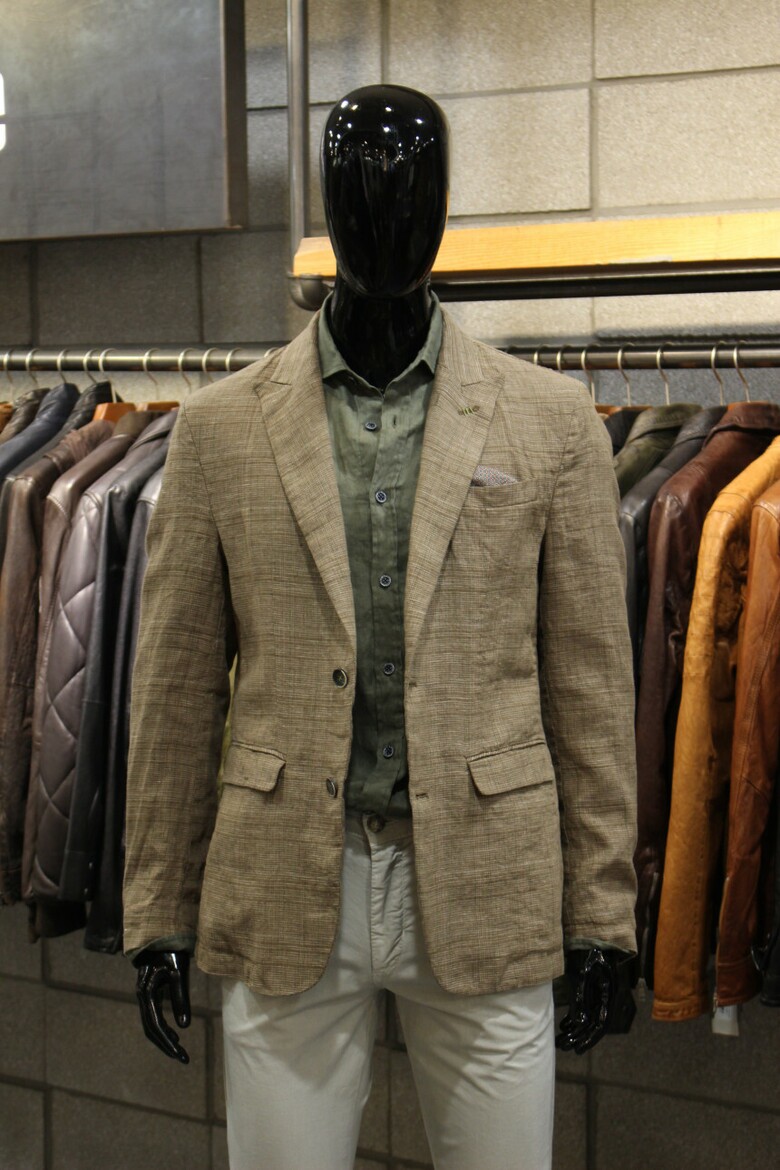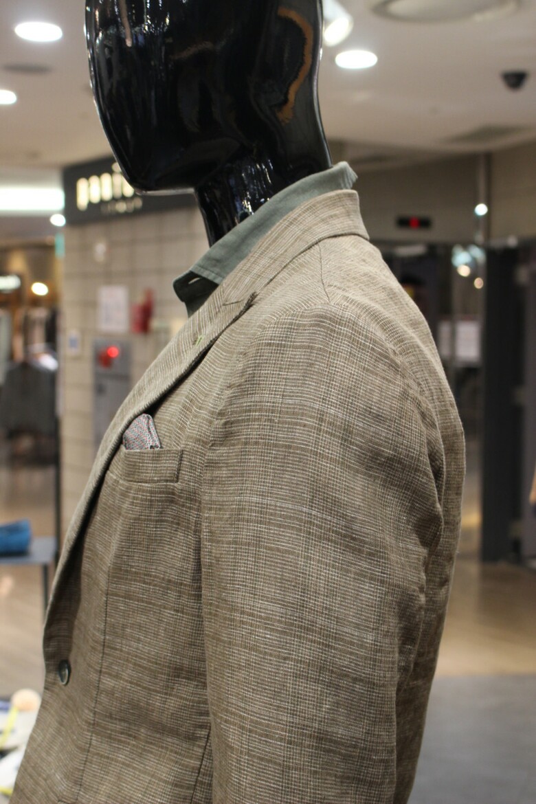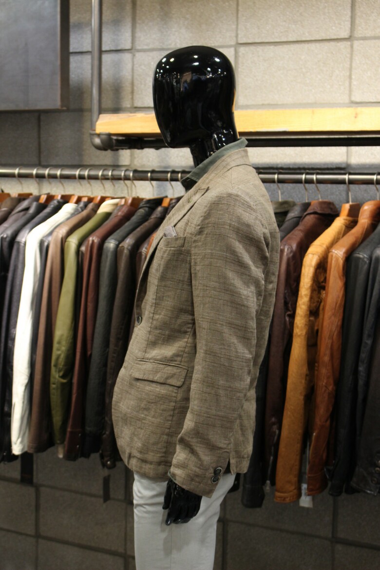 클래식한 느낌이 강조된 브라운체크 린넨자켓입니다