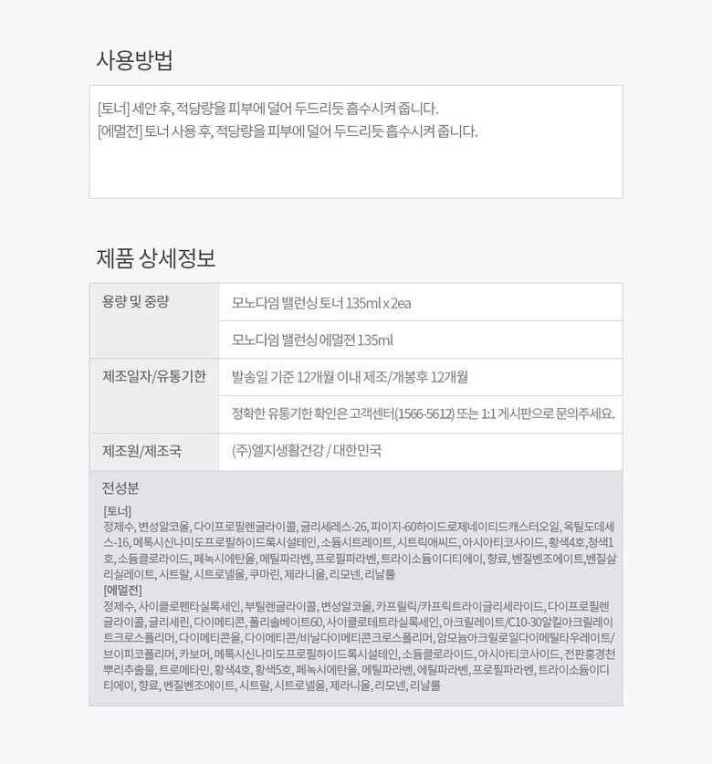 | 7. 주요성분 | 토너_정제수, 변성알코올, 다이프로필렌글라이콜, 글리세레스-26, 피이지-60하이드로제네이티드캐스터오일 외 상세페이지 참조
