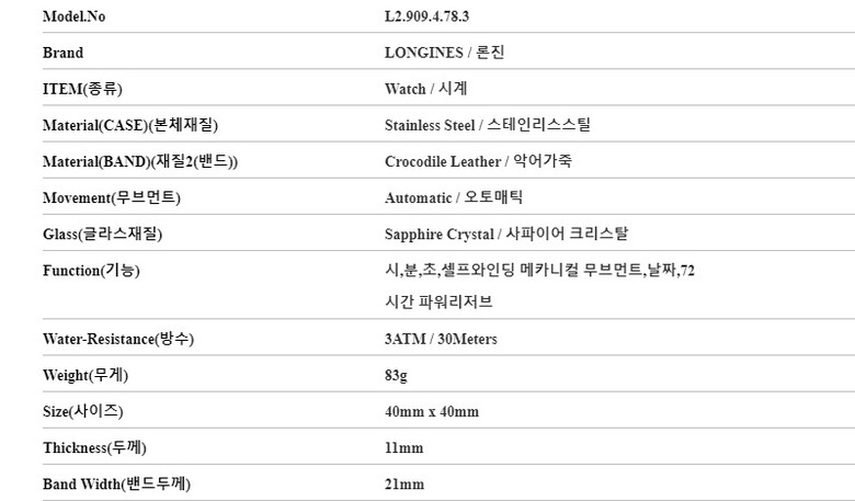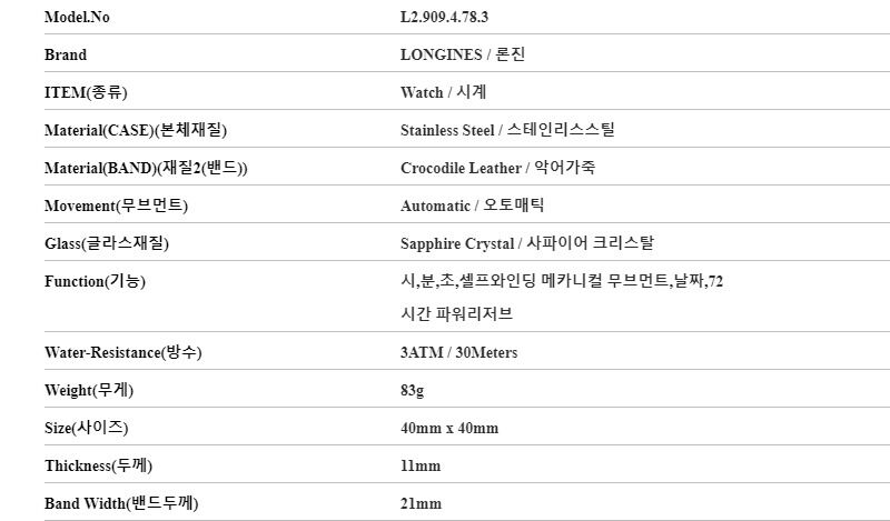 | 1. 소재 / 순도 / 밴드재질 | 실버/ 케이스 - 스테인리스스틸 / 밴드 - 악어가죽 |