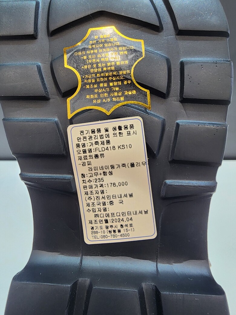 | 1. 제품 소재 (운동화인 경우에는 겉감, 안감을 구분하여 표시) | 라미네이팅가죽 |
