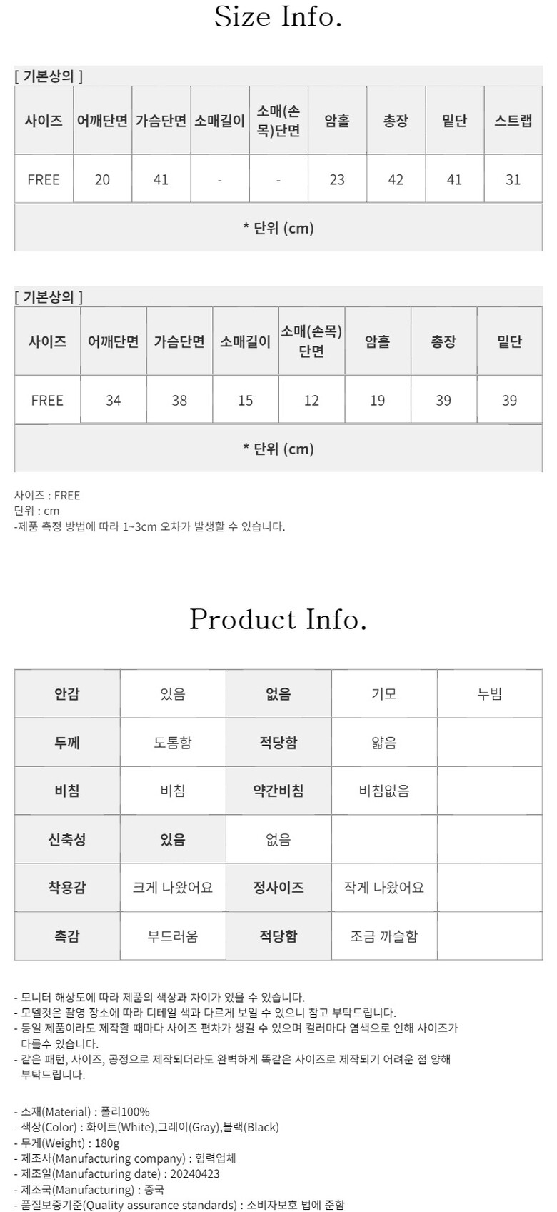 [ 기본상의 ] 어깨단면 / 가슴단면 / 소매길이 / 소매(손목)단면 / 암홀 / 총장 / 밑단 / 스트랩 (FREE)20 / 41 / - / - / 23 / 42 / 41 / 31 [ 기본상의 ] 어깨단면 / 가슴단면 / 소매길이 / 소매(손목)단면 / 암홀 / 총장 / 밑단 (FREE)34 / 38 / 15 / 12 / 19 / 39 / 39