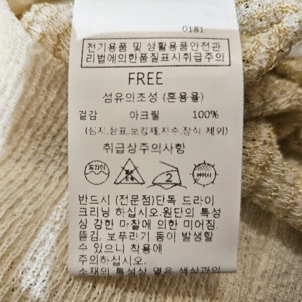 | 1. 제품 소재 (섬유의 조성 또는 혼용률을 백분율로 표시, 기능성인 경우 성적서 또는 허가서) | 겉감 - 아크릴100% |