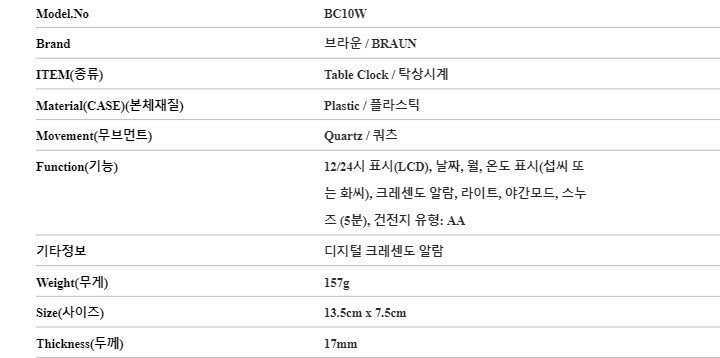 7. 주요 사양 | 플라스틱 탁상시계 쿼츠 |